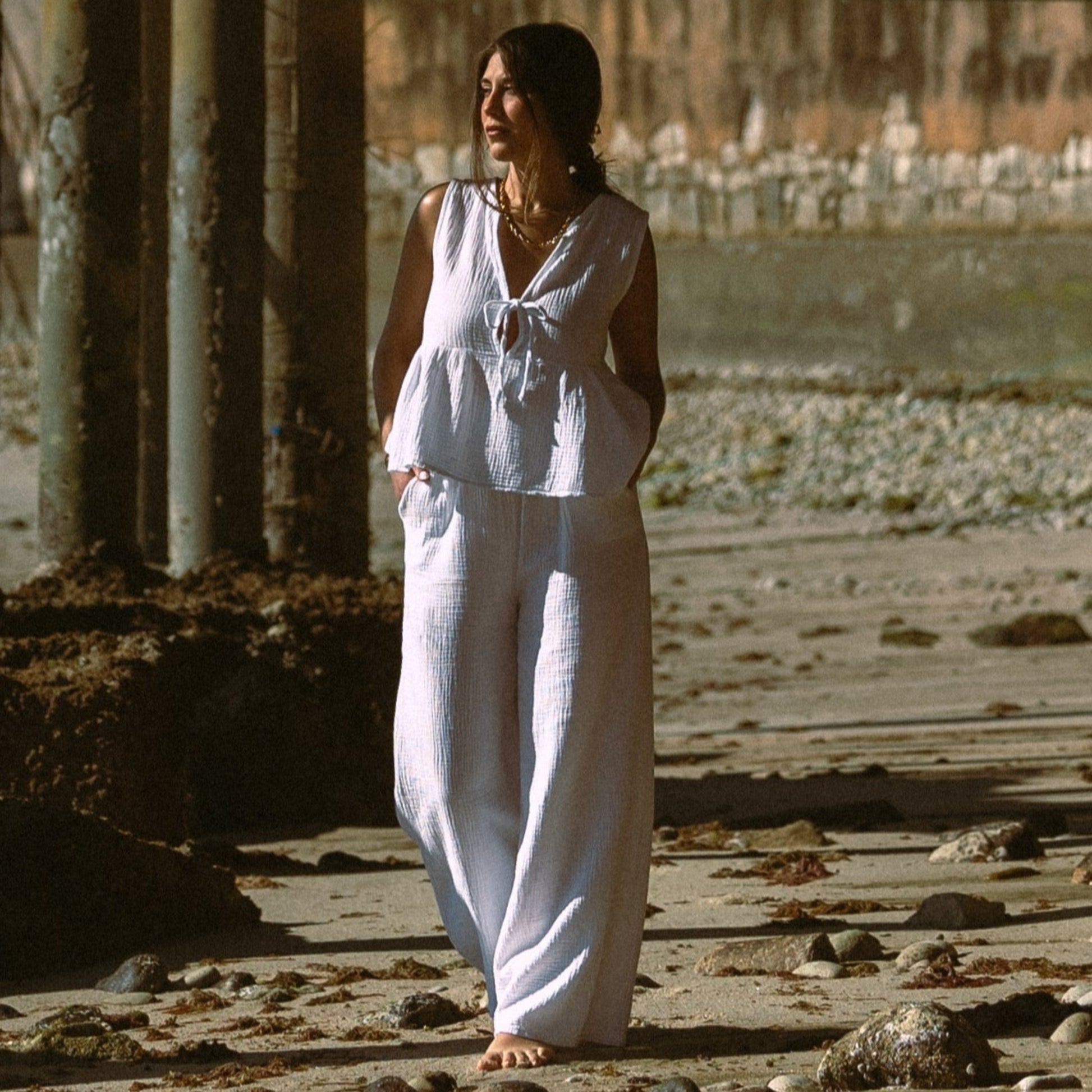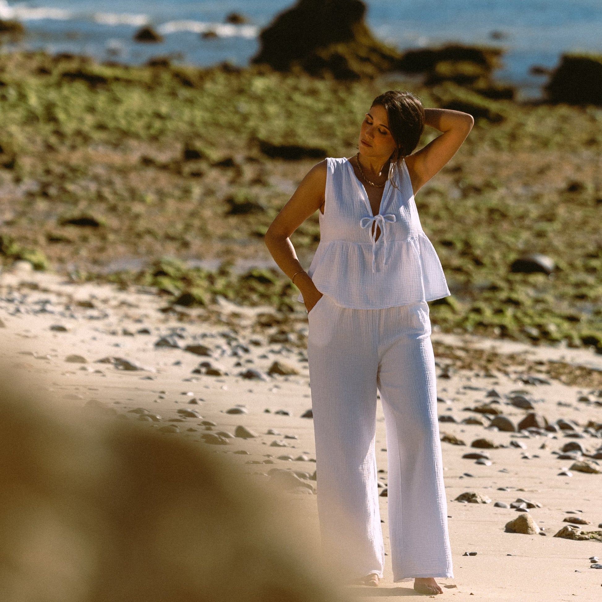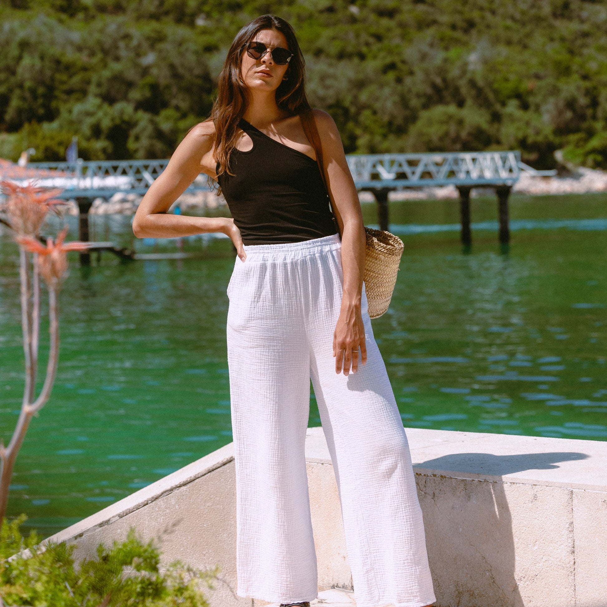 Calças em gaze de algodão com elástico na cintura e bolsos laterais.