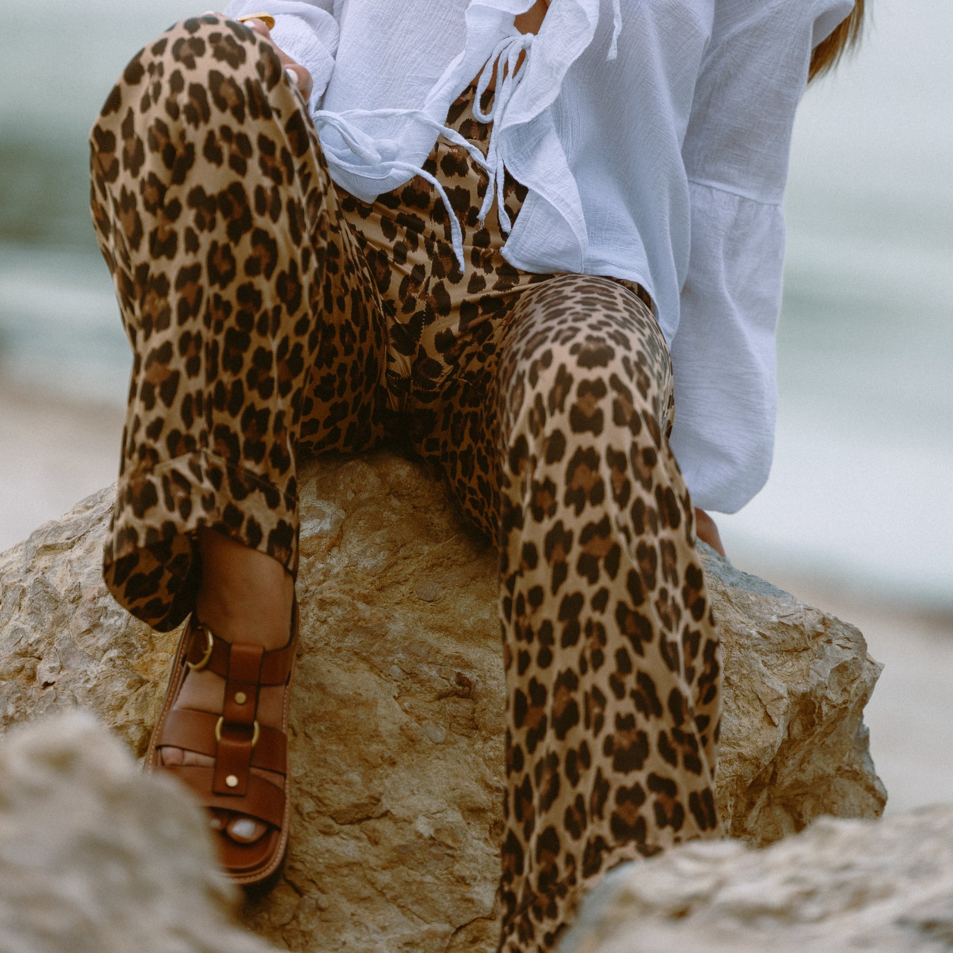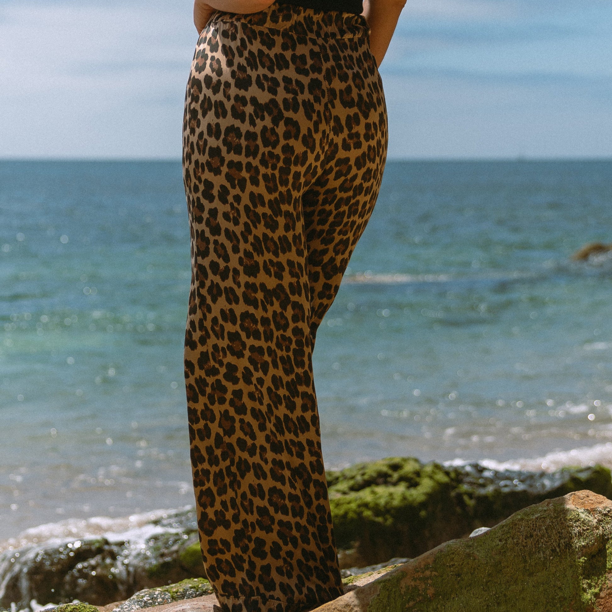 Calças leves e fluidas, em cetim, com cós elástico. A tendência deste verão.