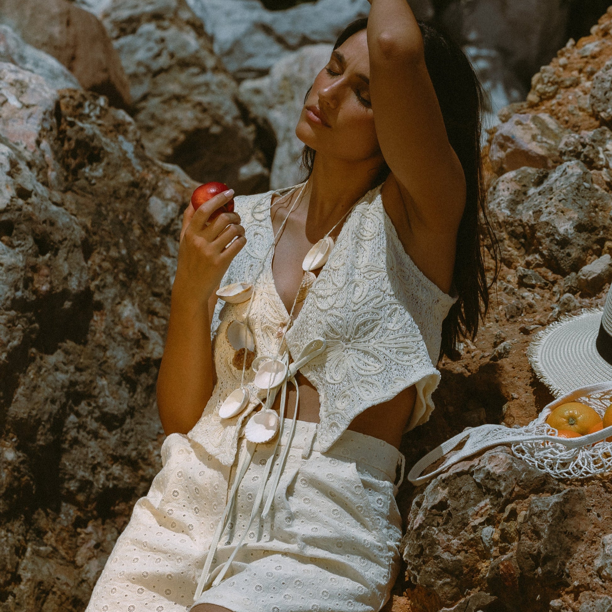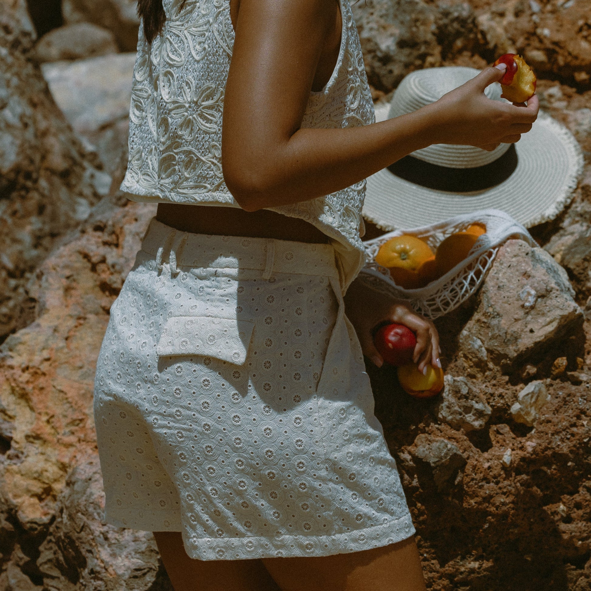 Calções de cintura alta com bolsos laterais, detalhe de pregas à frente e bolso falso atrás. Bordados no mesmo tom.