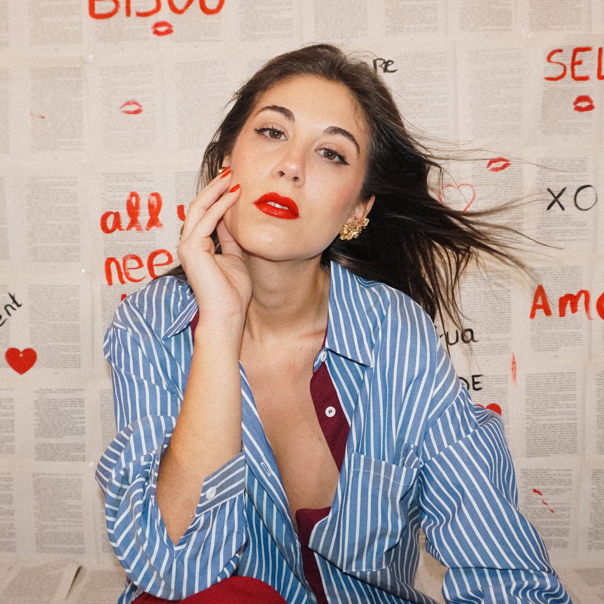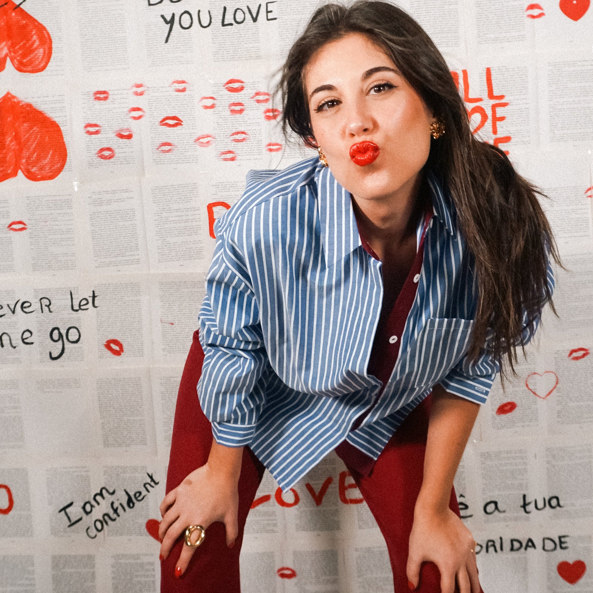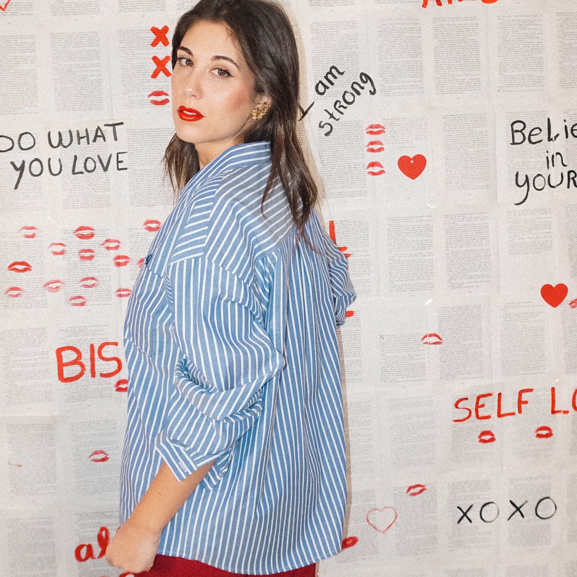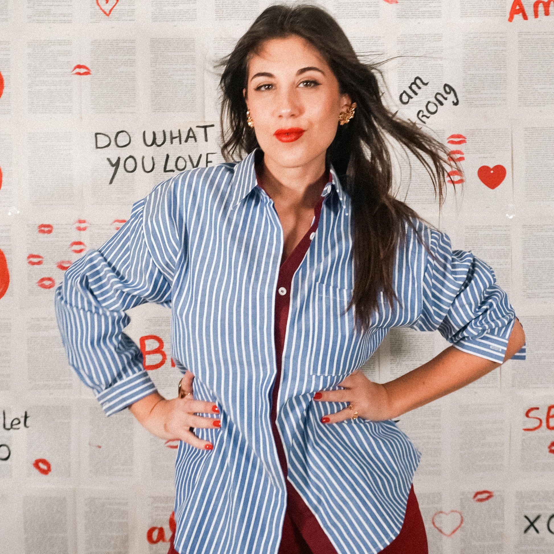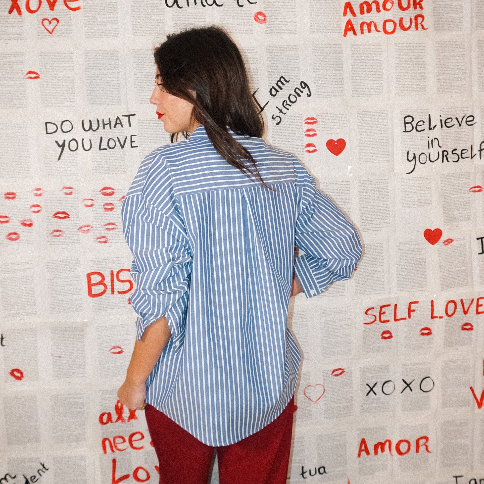 Camisa oversize ás riscas com gola de abas.