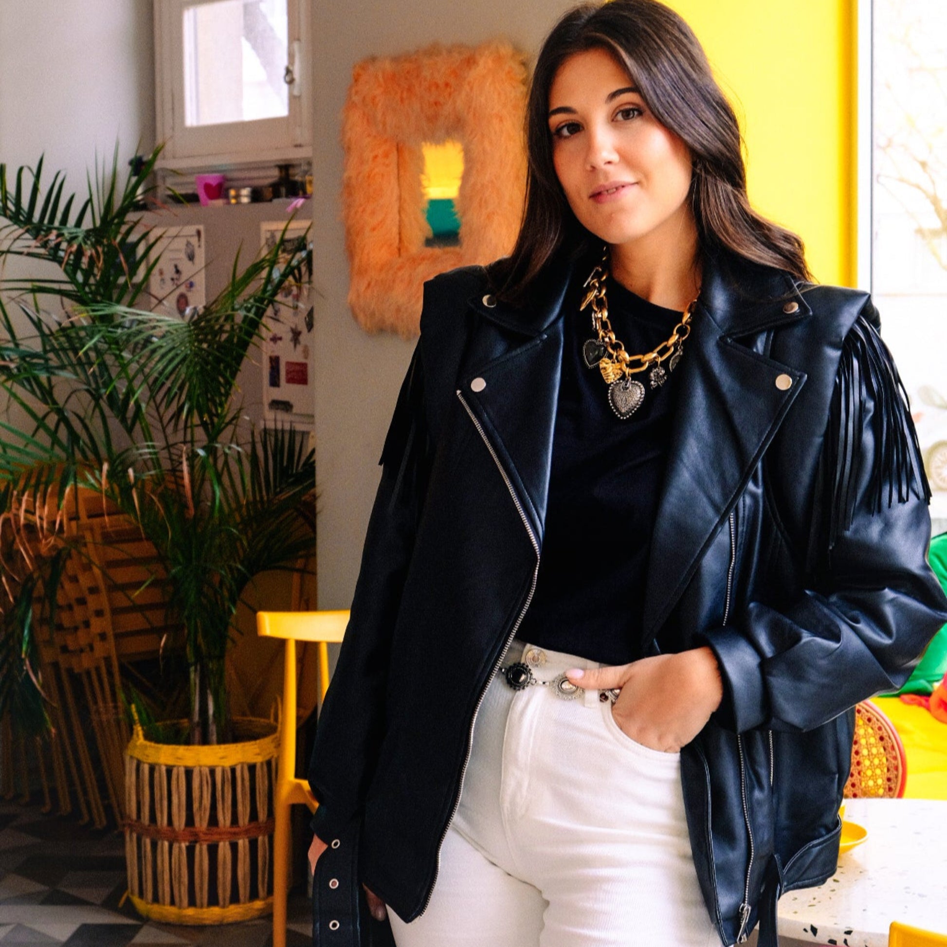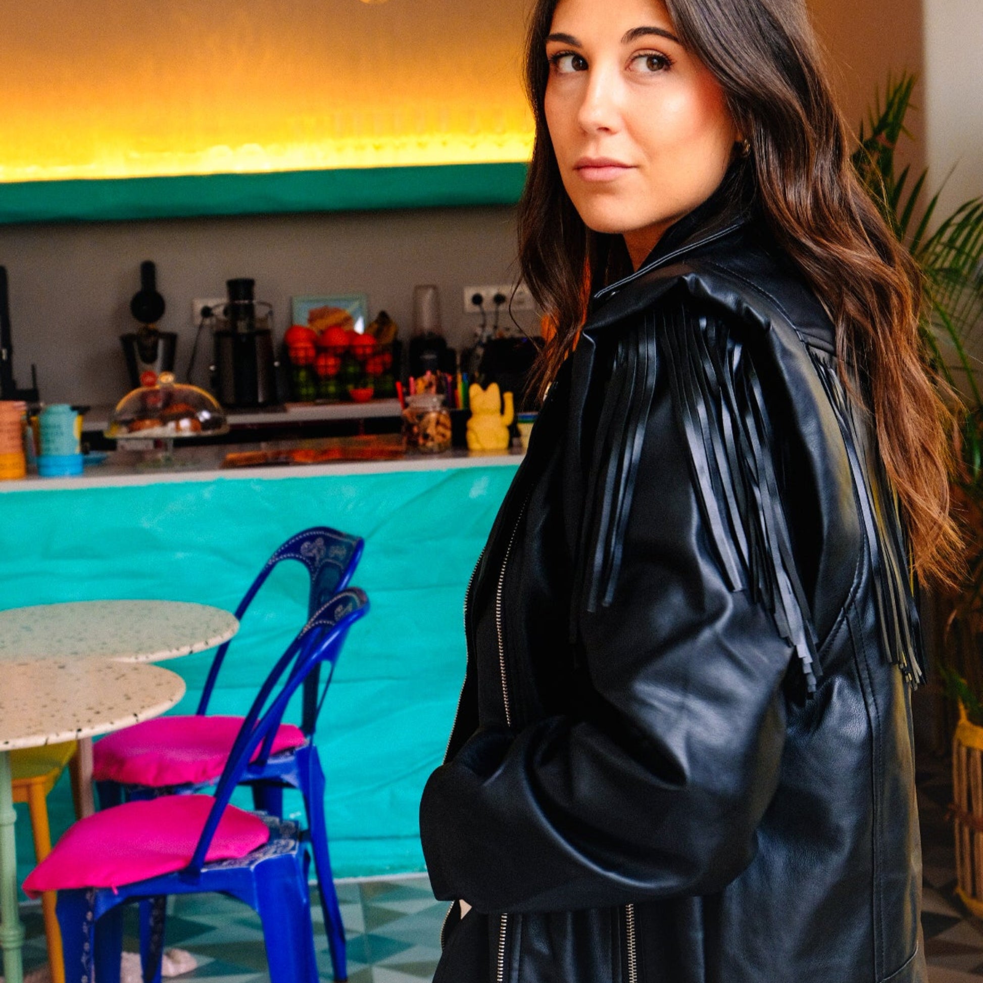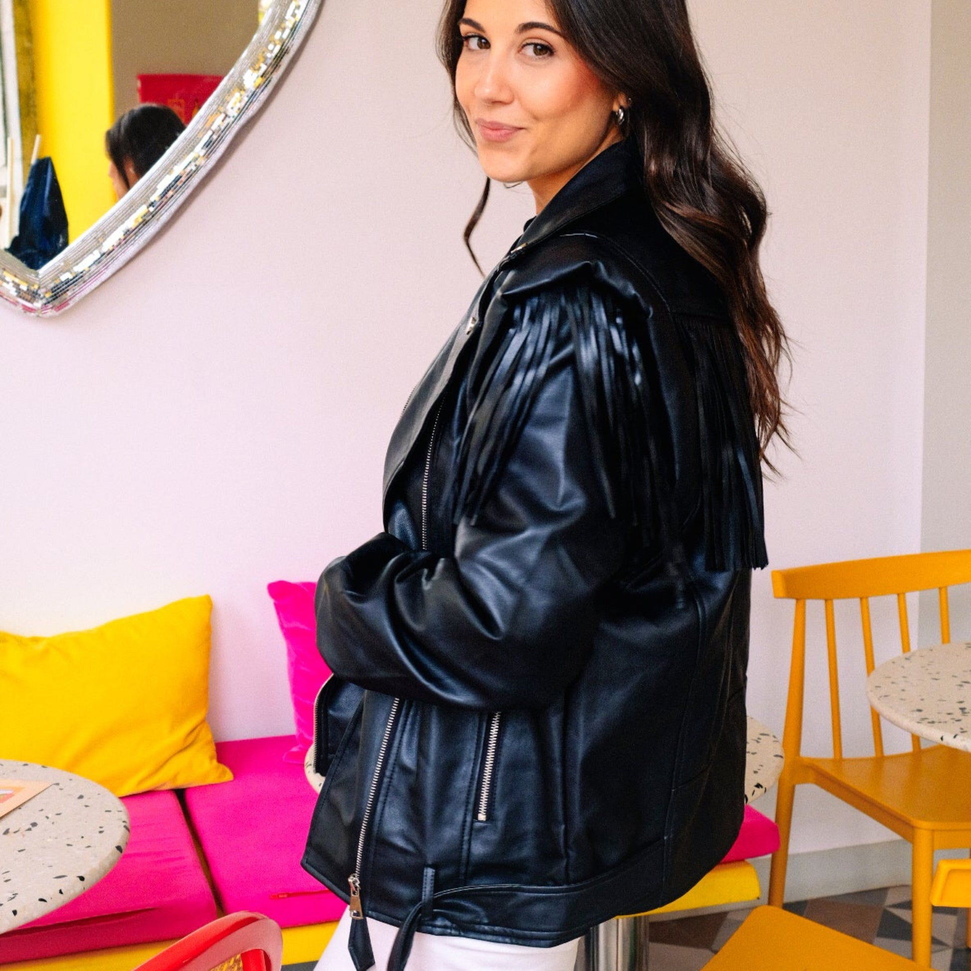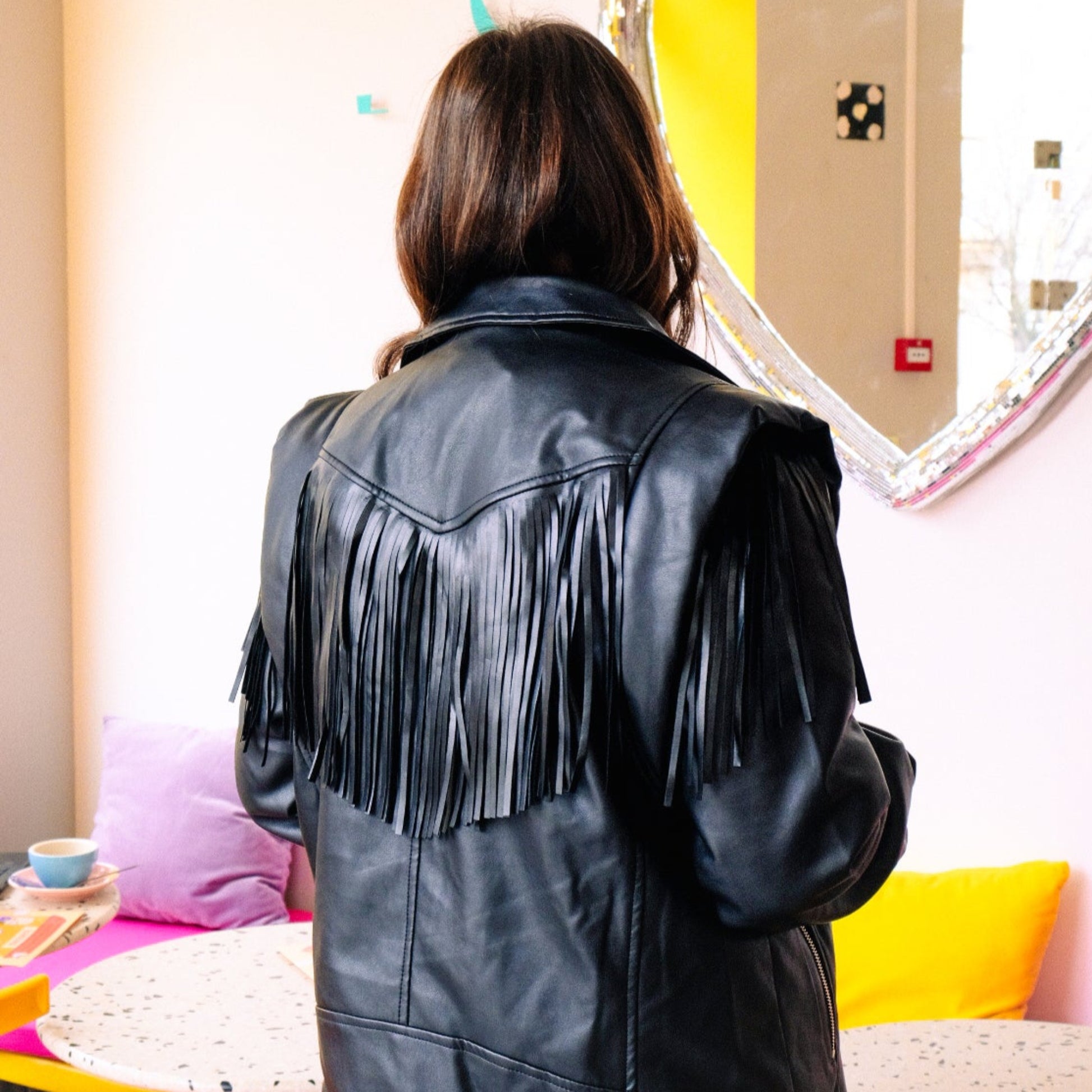 Blusão em pele sintética com ombreiras e franjas. Fecho prateado de correr e cinto do mesmo tecido.