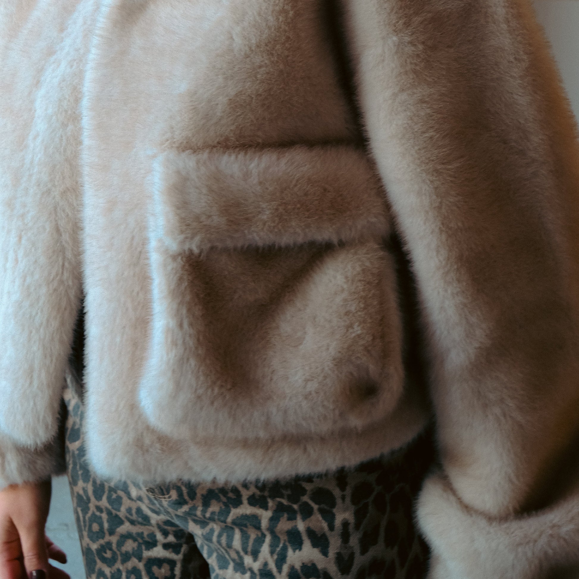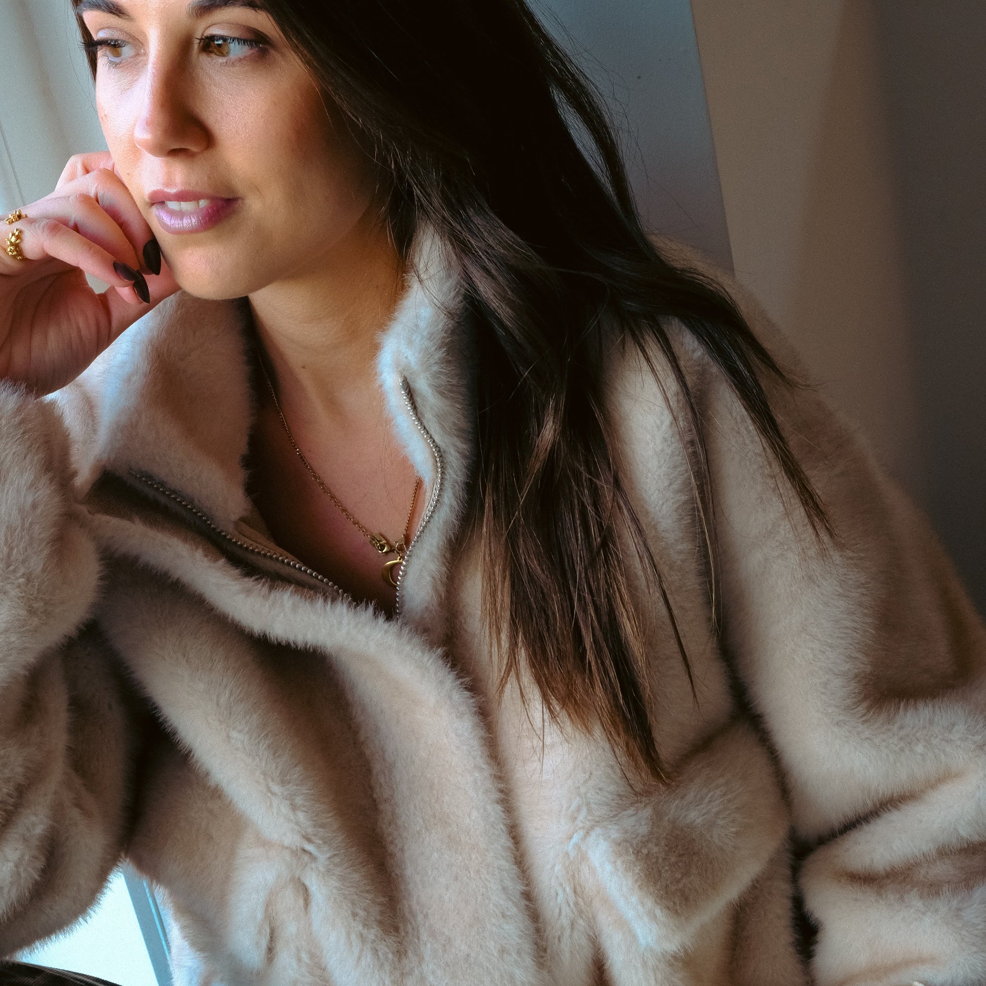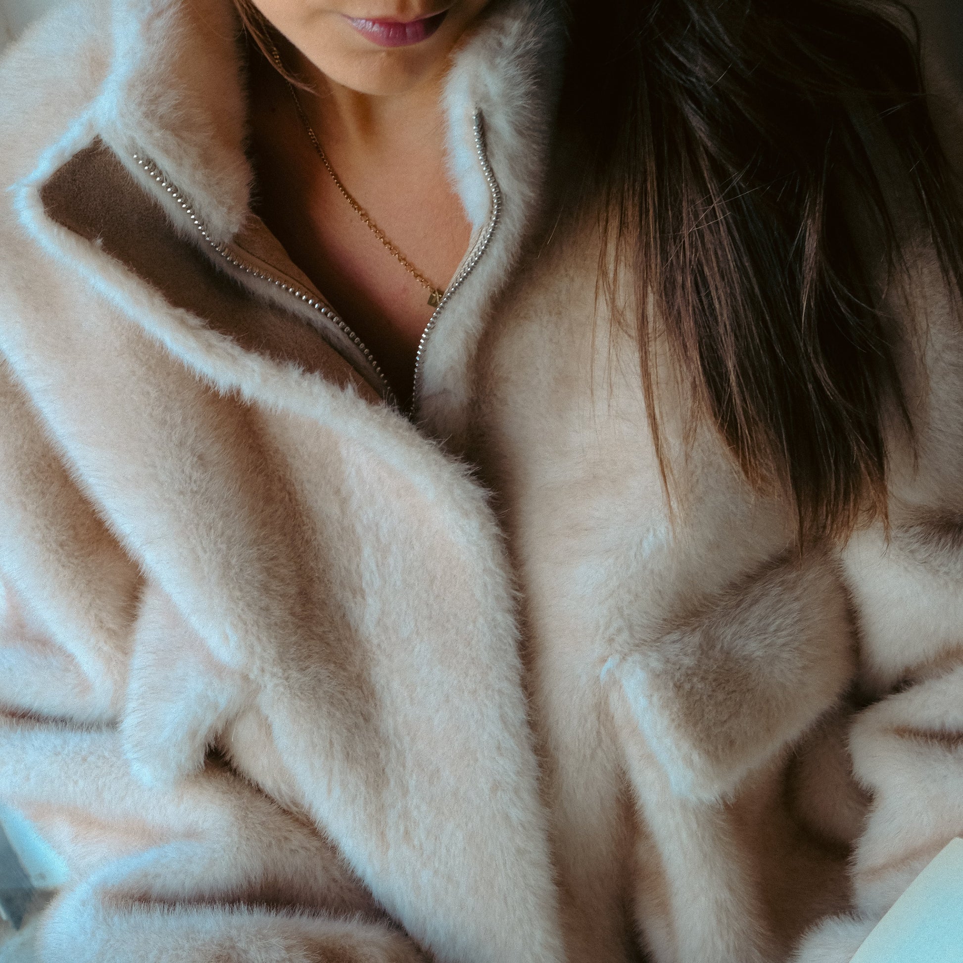 Fecho frontal com fecho de correr. Punho com acabamento em elástico.