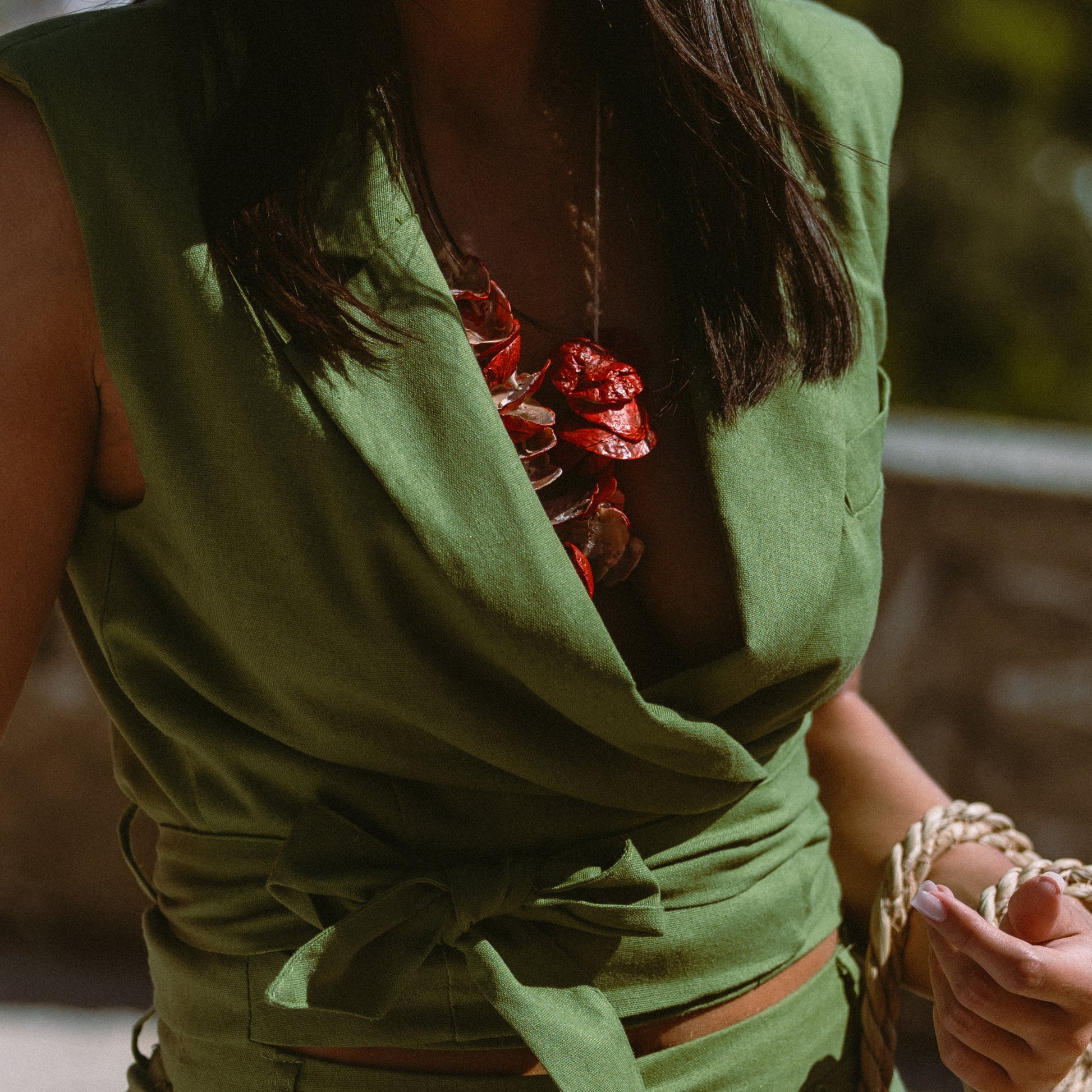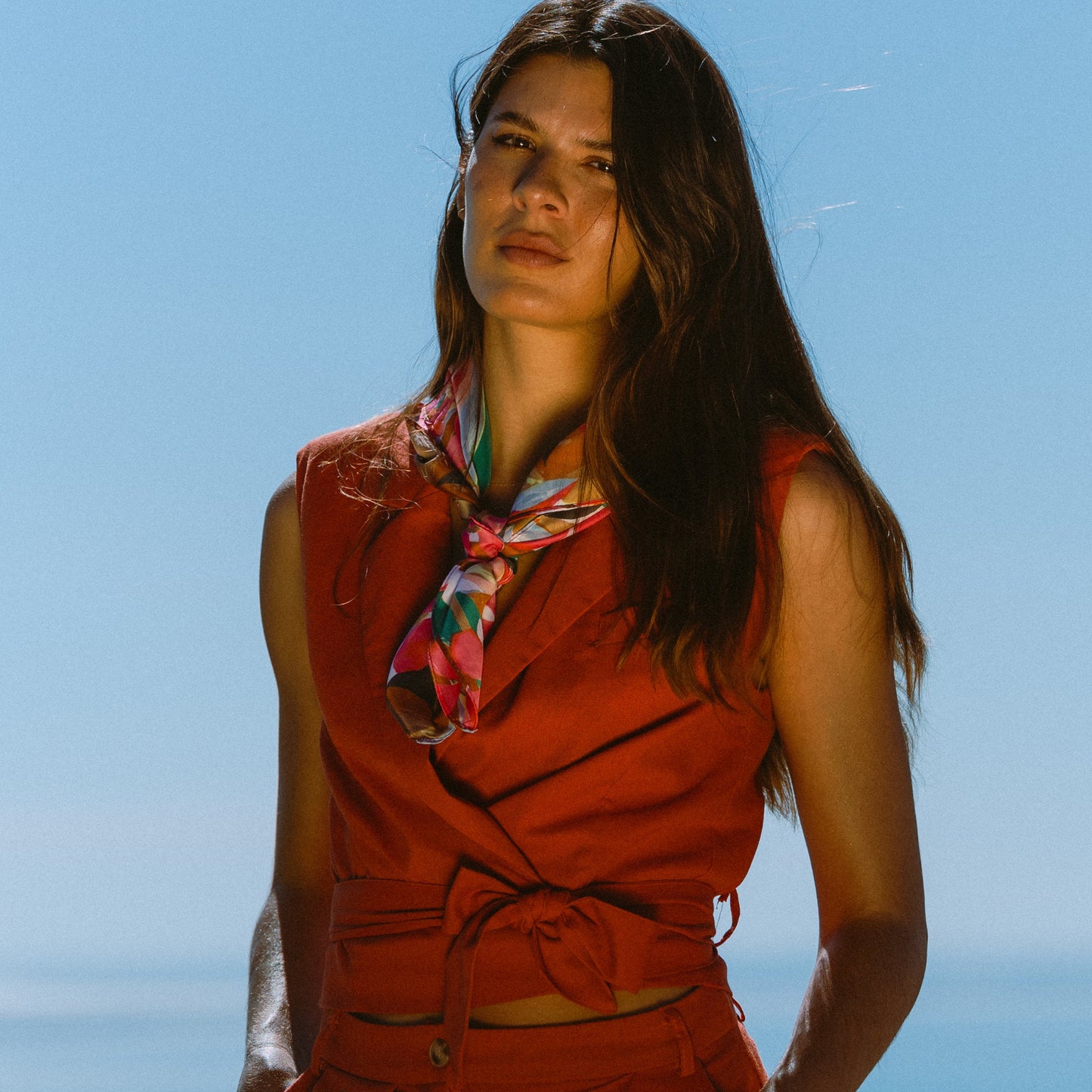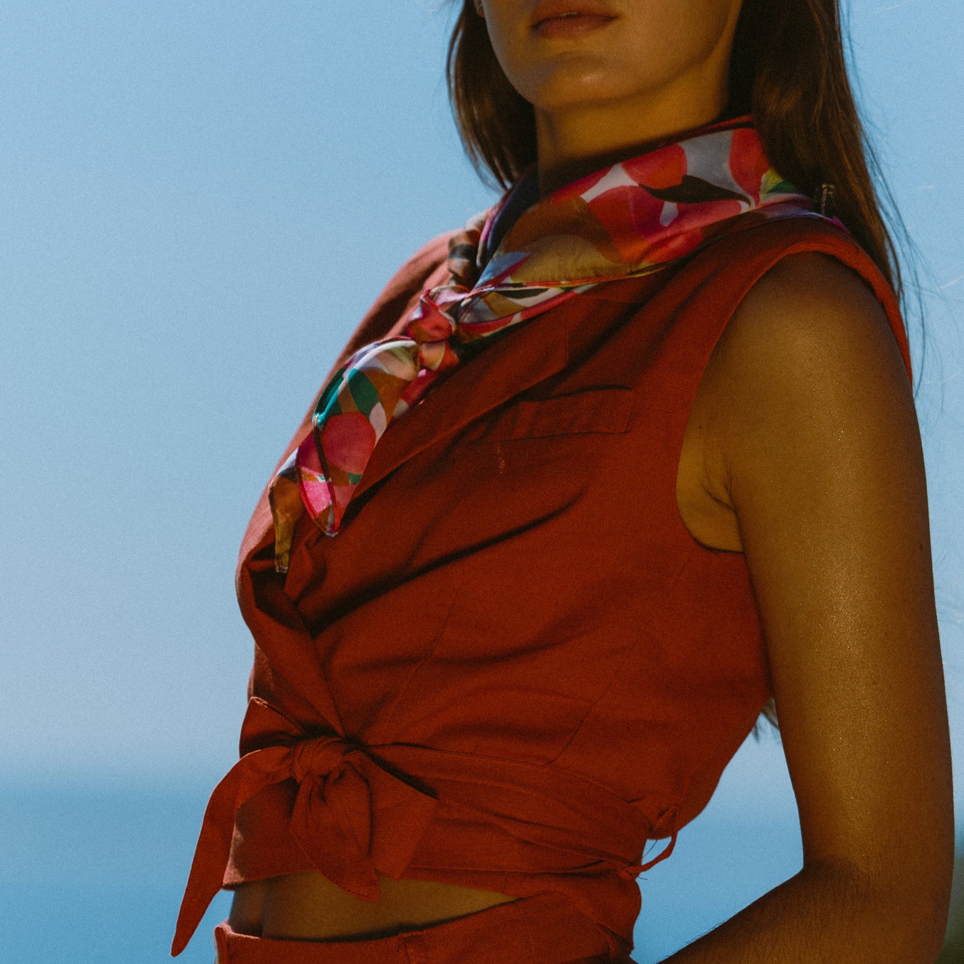 Gilet curto, ajustável e com possibilidade de fecho à frente ou atrás. Detalhe de bolso falso e botão frontal.