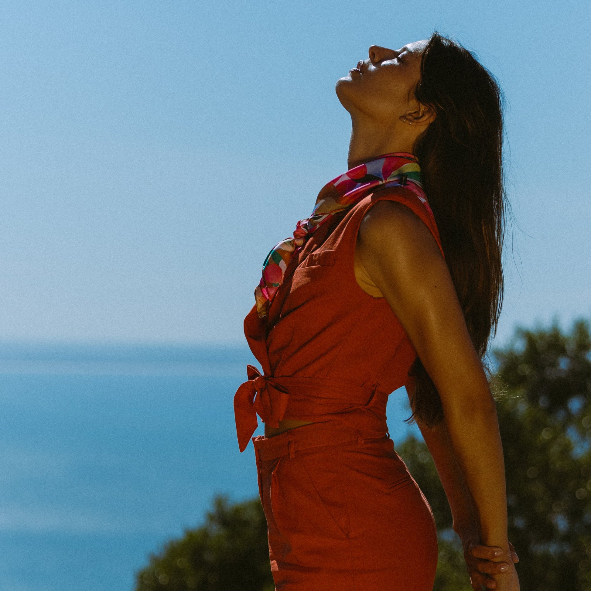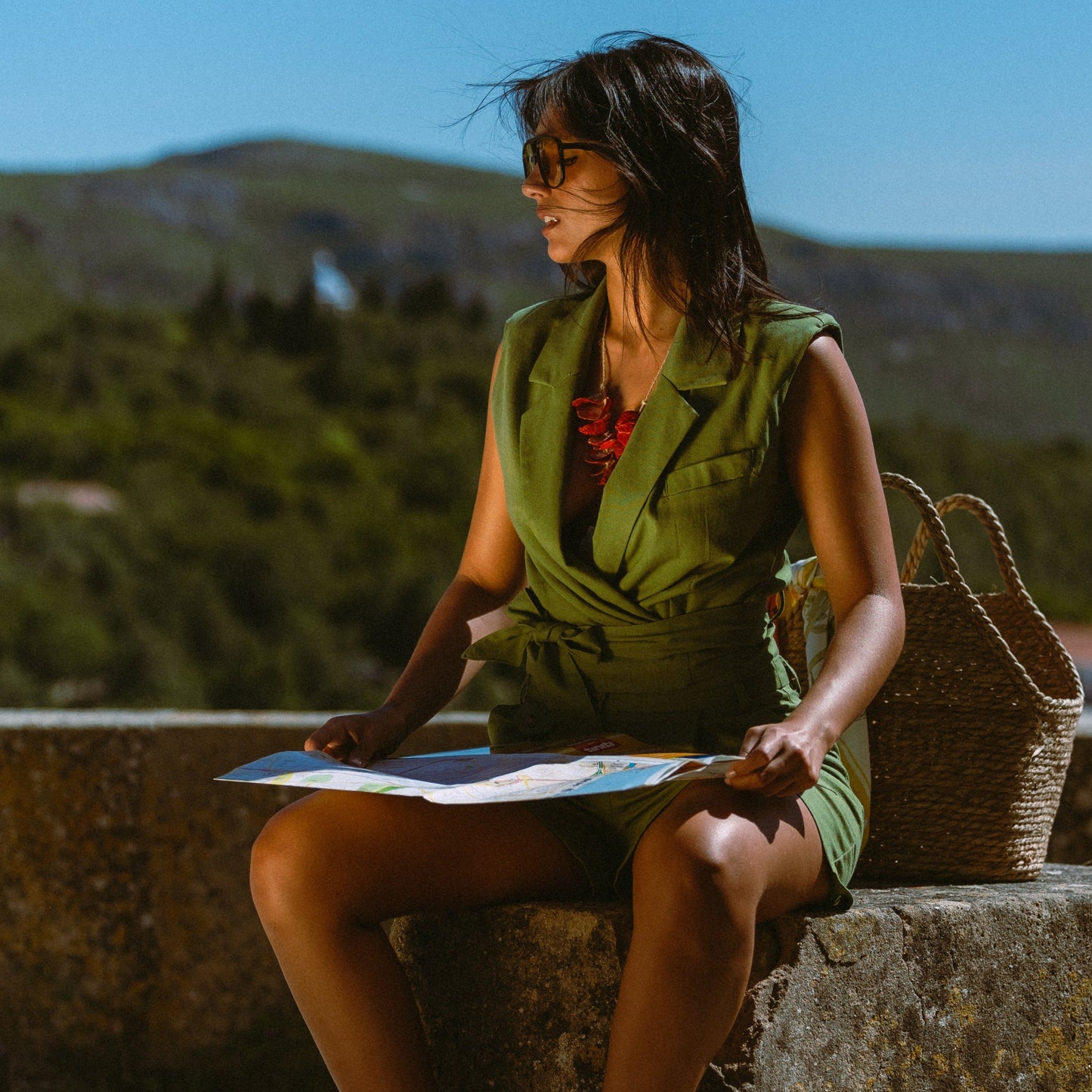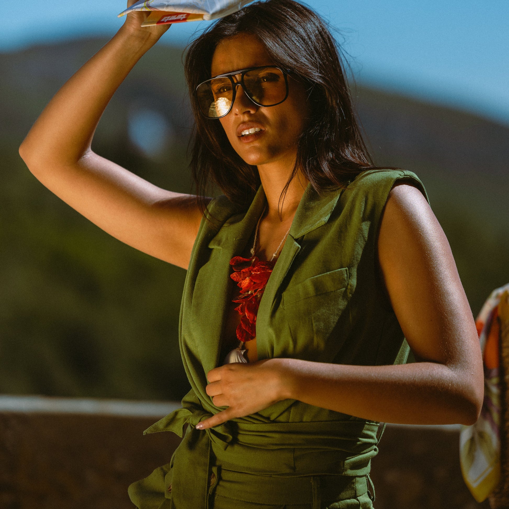 Gilet curto, ajustável e com possibilidade de fecho à frente ou atrás. Detalhe de bolso falso e botão frontal.