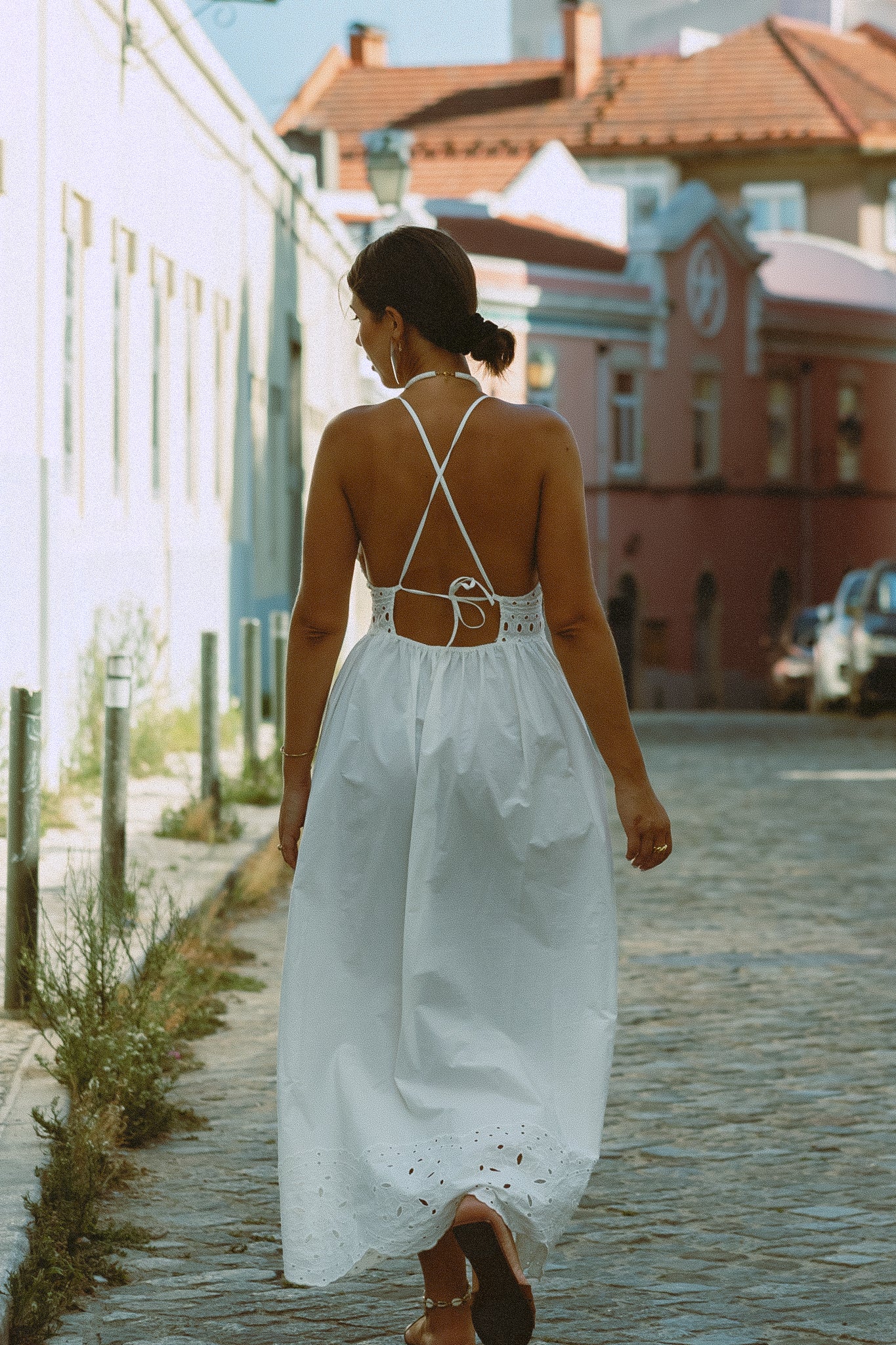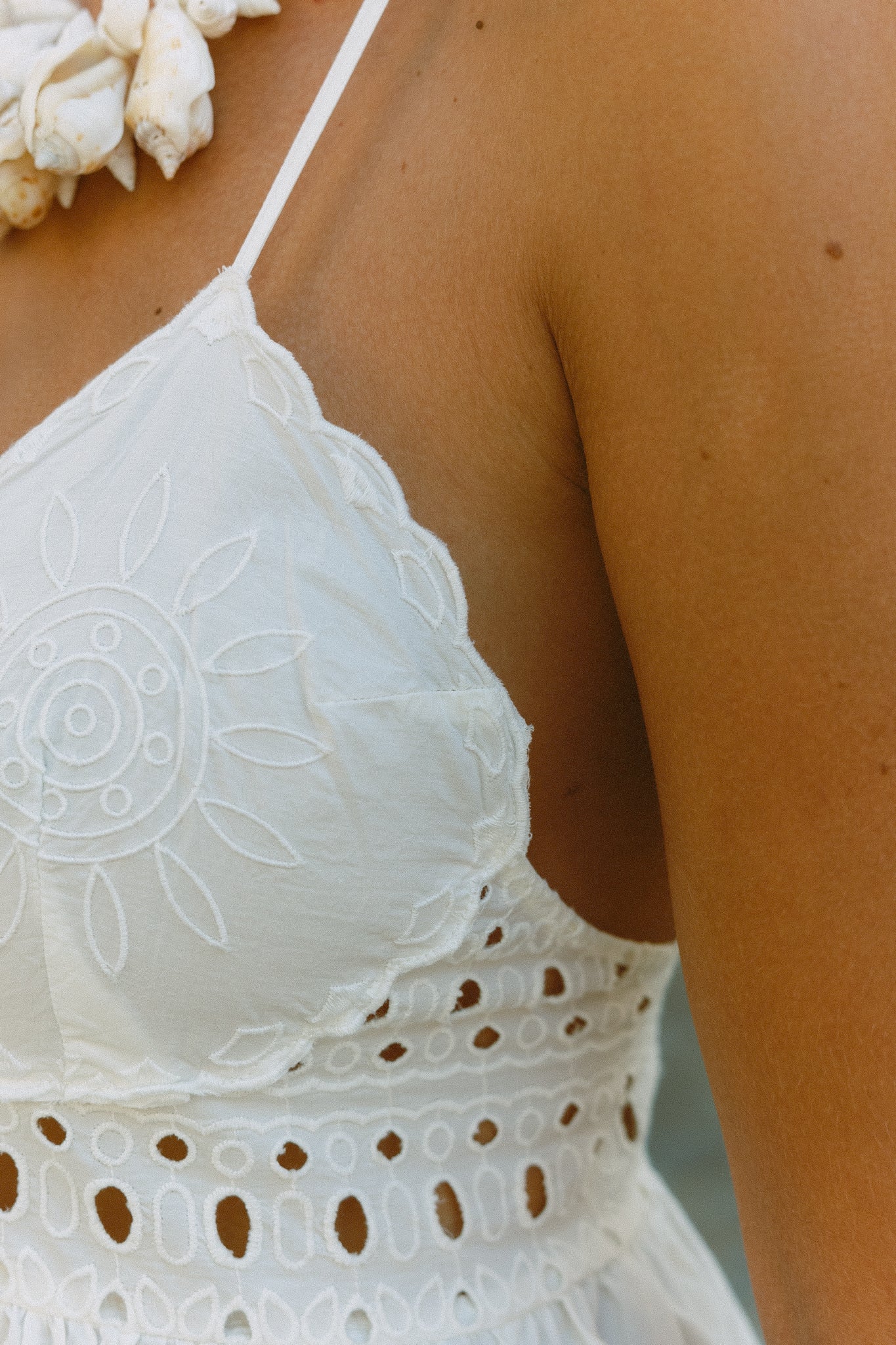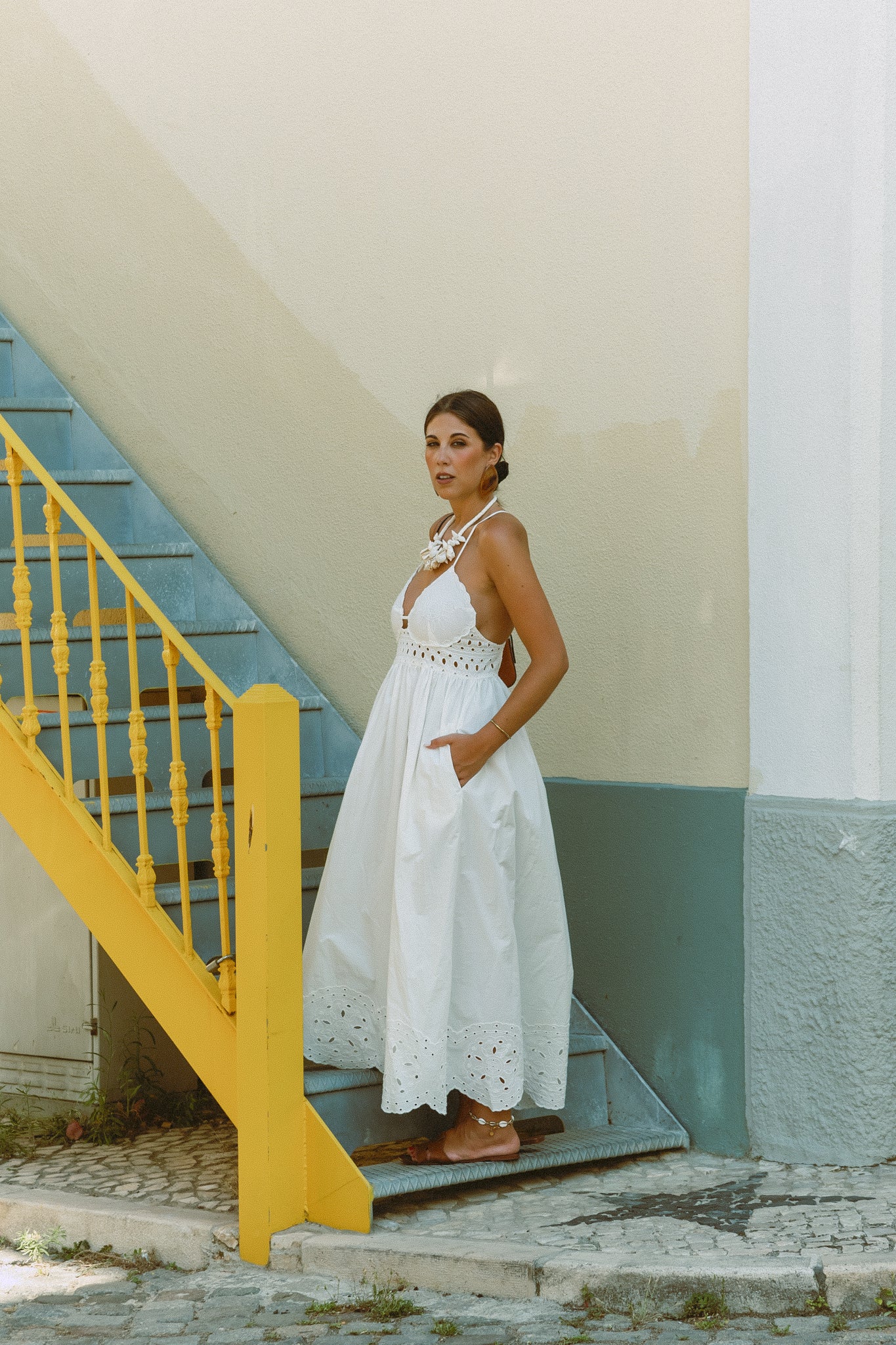 Vestido em bordado inglês, cruzado atrás, com bolsos laterais.