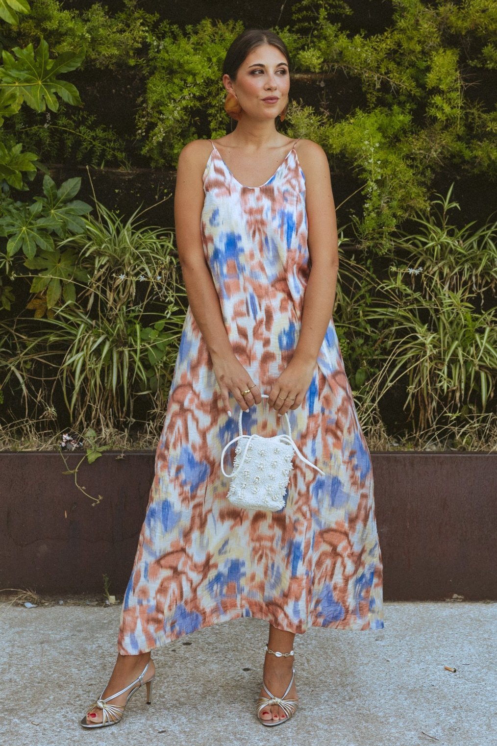 Vestido comprido com padrão Tie & Dye, com decote magnífico nas costas em que alças finas se cruzam entre 4 lindas pedras.