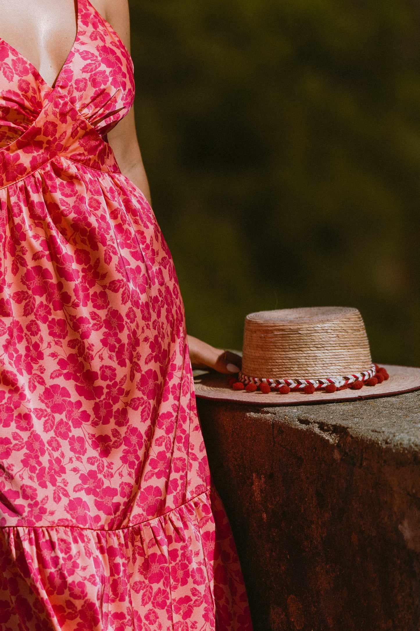 Vestido comprido, com alças finas ajustáveis, cruzadas nas costas, e decote em V.